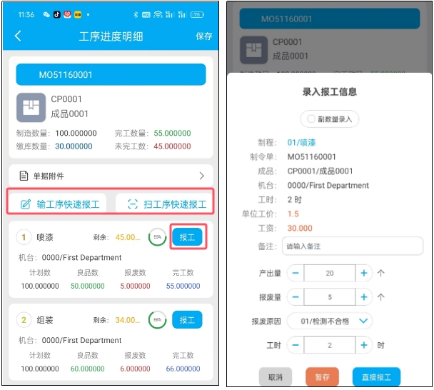 3.2、通過工序進度單進行報工 在工序明細界面,可以通過掃工序或者點擊報工按鈕進行報工。錄入報工信息后會自動計算出工資。