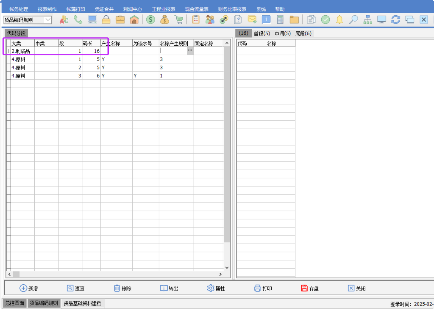 貨品資料建檔中,希望新增貨品時,貨品代號錄入的內容要達到或者超過某位長度才允許存盤,否則不允許存盤 1.首先進行貨品編碼規則設置,如大類制成品控制碼長16位,選擇大類,輸入碼長