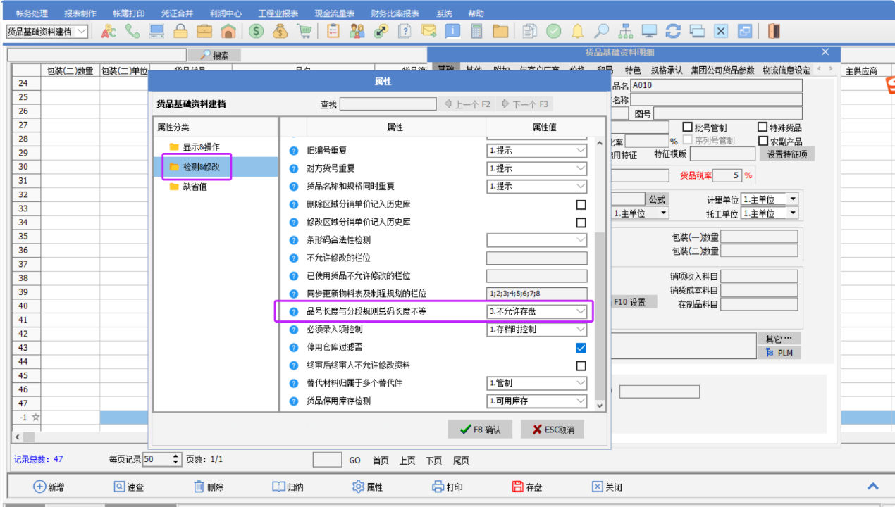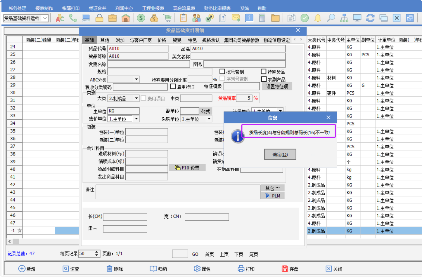2.貨品資料建檔屬性設置,《品號長度與分段規則總碼長度不等--不允許存盤》