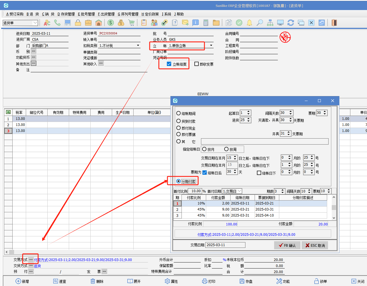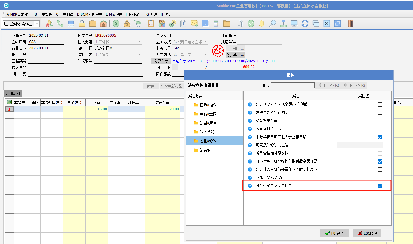 (3)進(jìn)貨立賬收票作業(yè)勾選屬性“分期付款單據(jù)發(fā)票補(bǔ)錄”