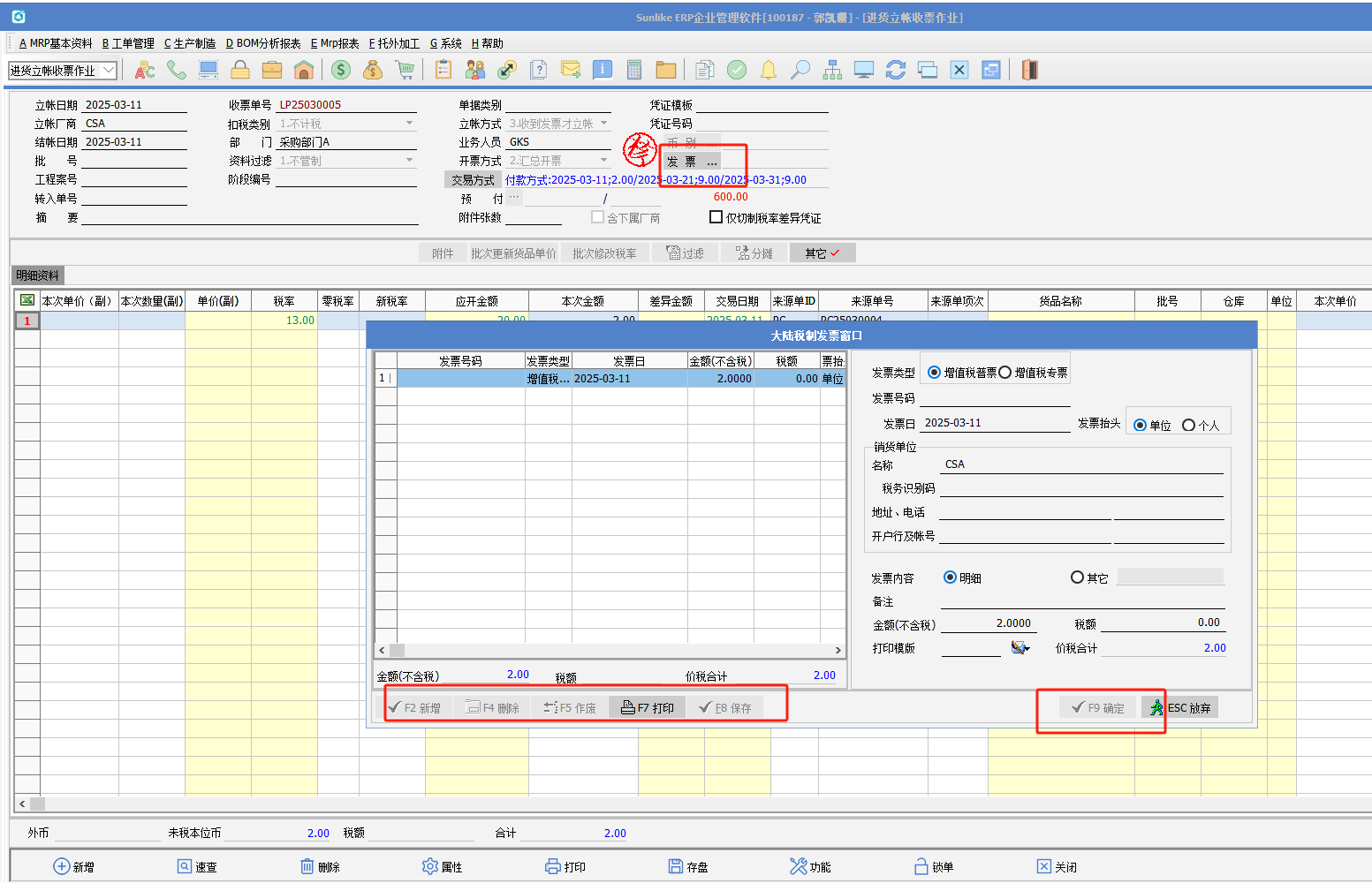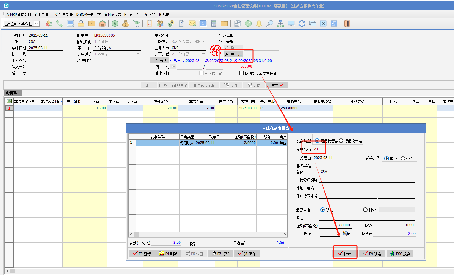 1.不勾選:系統(tǒng)無(wú)法錄入發(fā)票號(hào)碼; 2.勾選:當(dāng)進(jìn)貨立賬收票是由分期付款方式產(chǎn)生的,大陸制發(fā)票視窗(INV_No_DLS):增加“補(bǔ)錄”按鈕。通過(guò)該按鈕,可以將視窗中的發(fā)票記錄保存至發(fā)票庫(kù)。 具體處理如下:點(diǎn)擊該按按鈕時(shí),程序?qū)⒏鶕?jù)發(fā)票視窗的結(jié)果進(jìn)行以下回寫處理: 補(bǔ)錄檢測(cè):管控視窗中所有記錄的“價(jià)稅合計(jì)”合計(jì)值必須小于等于單據(jù)的“金額”合計(jì)值。 補(bǔ)錄檢測(cè)通過(guò)后,執(zhí)行以下處理: 當(dāng)單據(jù)表頭庫(kù)[MF_LZ1].inv_no為空時(shí):將發(fā)票視窗第一筆記錄的“發(fā)票號(hào)碼”回寫至該字段。 將發(fā)票視窗的記錄保存至發(fā)票數(shù)據(jù)庫(kù)[INV_NO]。 將發(fā)票視窗的“發(fā)票號(hào)碼”按單據(jù)別+單據(jù)號(hào)碼保存至進(jìn)貨立賬開(kāi)票作業(yè)發(fā)票數(shù)據(jù)庫(kù)[MF_LZ1_INVNO]。 3.操作說(shuō)明(以進(jìn)貨單為例,銷貨單同理可參考): (1)進(jìn)貨單設(shè)置分期付款