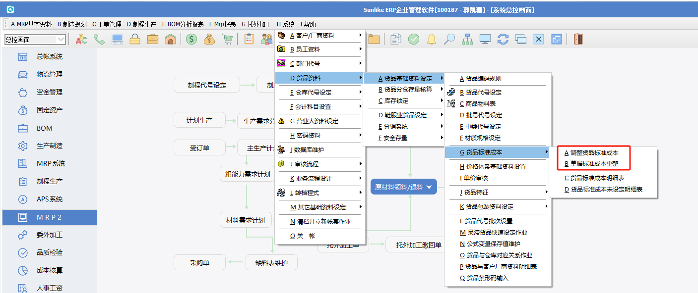 以原材料采購成本(采購政策、歷史價格、分倉成本等),再加上標準人工費用、標準制造費用等,按層級往上加,生成半成品、成品標準成本 1.刷新BOM的原料成本 路徑:系統--貨品資料--貨品基礎資料設定--貨品標準成本