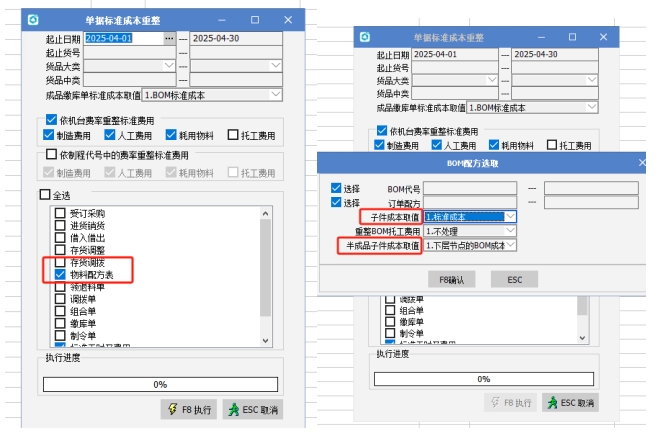 (2)做單據標準成本重整,勾選“物料配方表”,重整BOM的成本,子件成本取值和半成品子件成本取值可以依據屬性取標準成本或BOM成本。