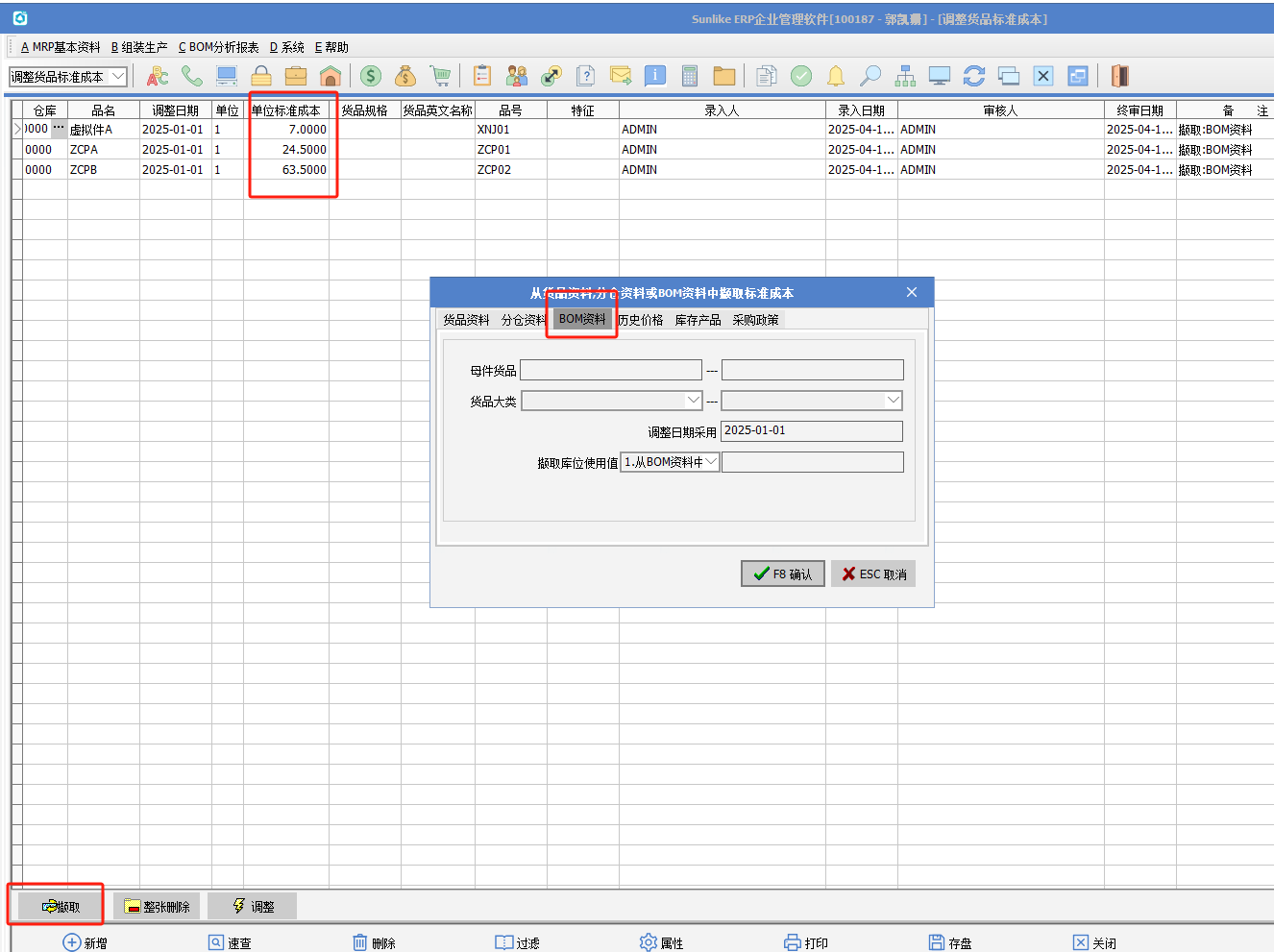 3.將標準配方BOM的母件貨品的成本寫入到貨品標準成本 擷取按鈕--選擇BOM資料--點擊確認按鈕后,會將標準配方BOM的母件貨品的生產成本寫入調整貨品標準成本。