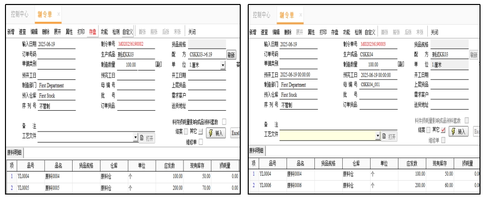 3.3此時排產單成品明細會列示制令單的表頭信息,料件明細則列示料件的詳細信息。