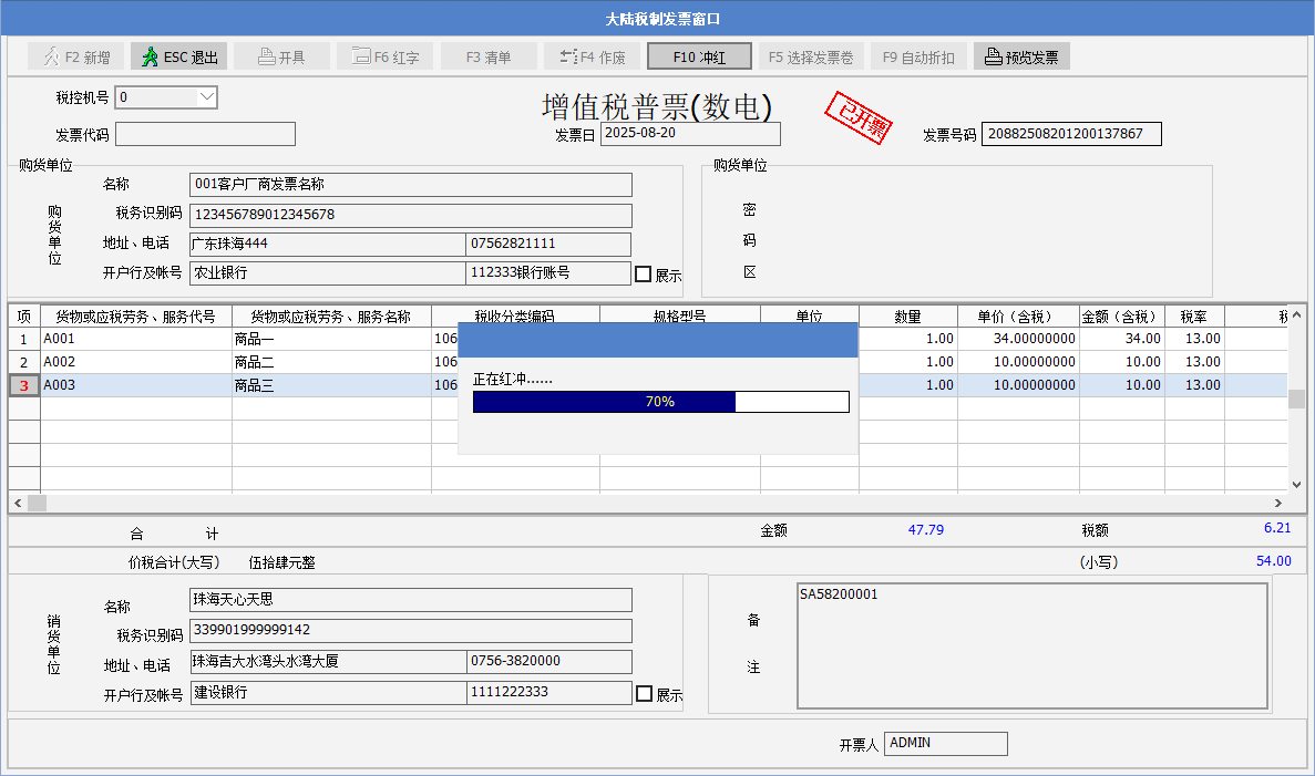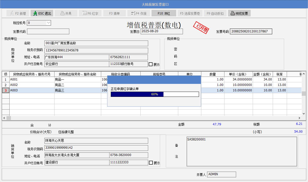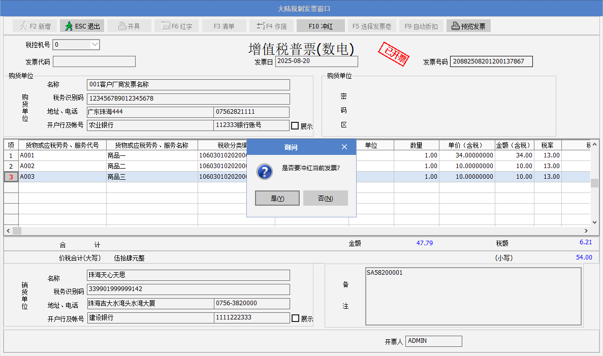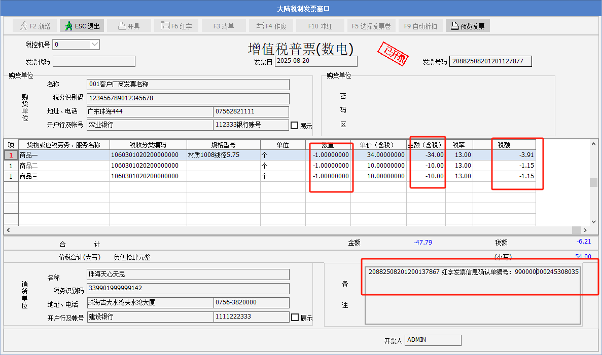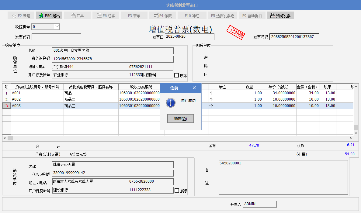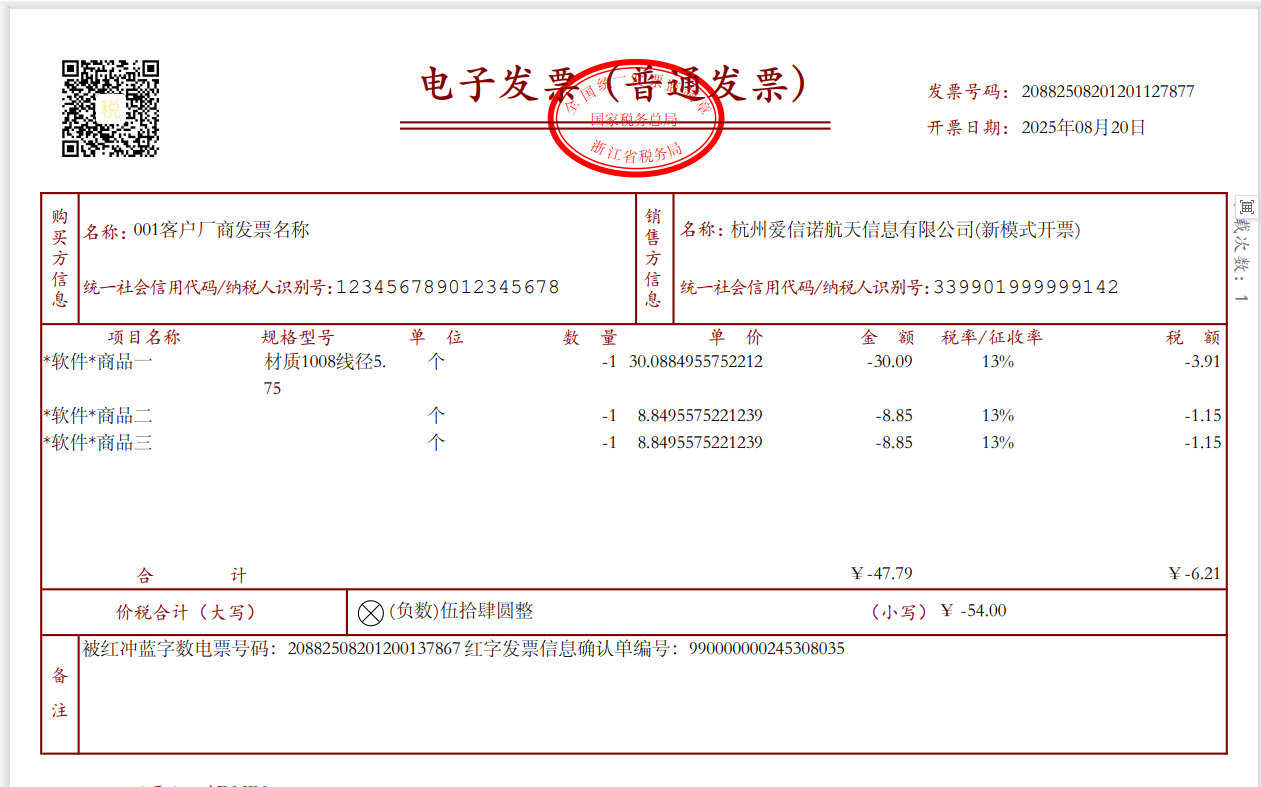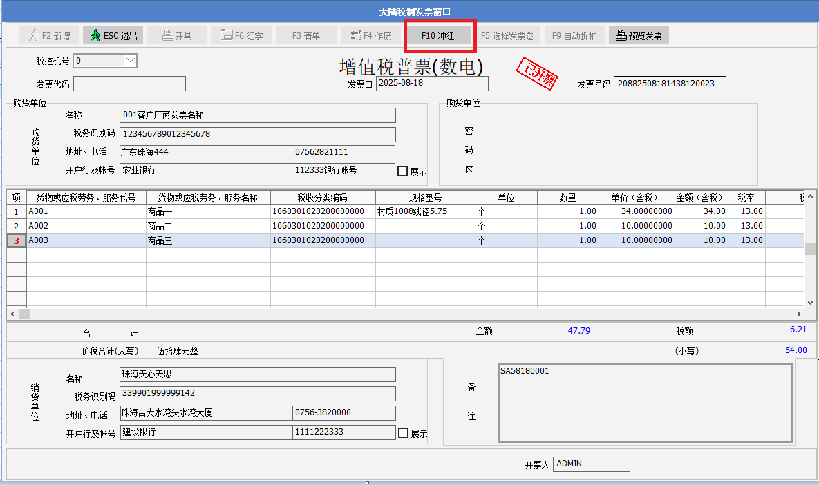 6. 單據(jù)的發(fā)票紅沖后,可以修改單據(jù),繼續(xù)開出新的數(shù)電發(fā)票。