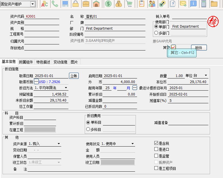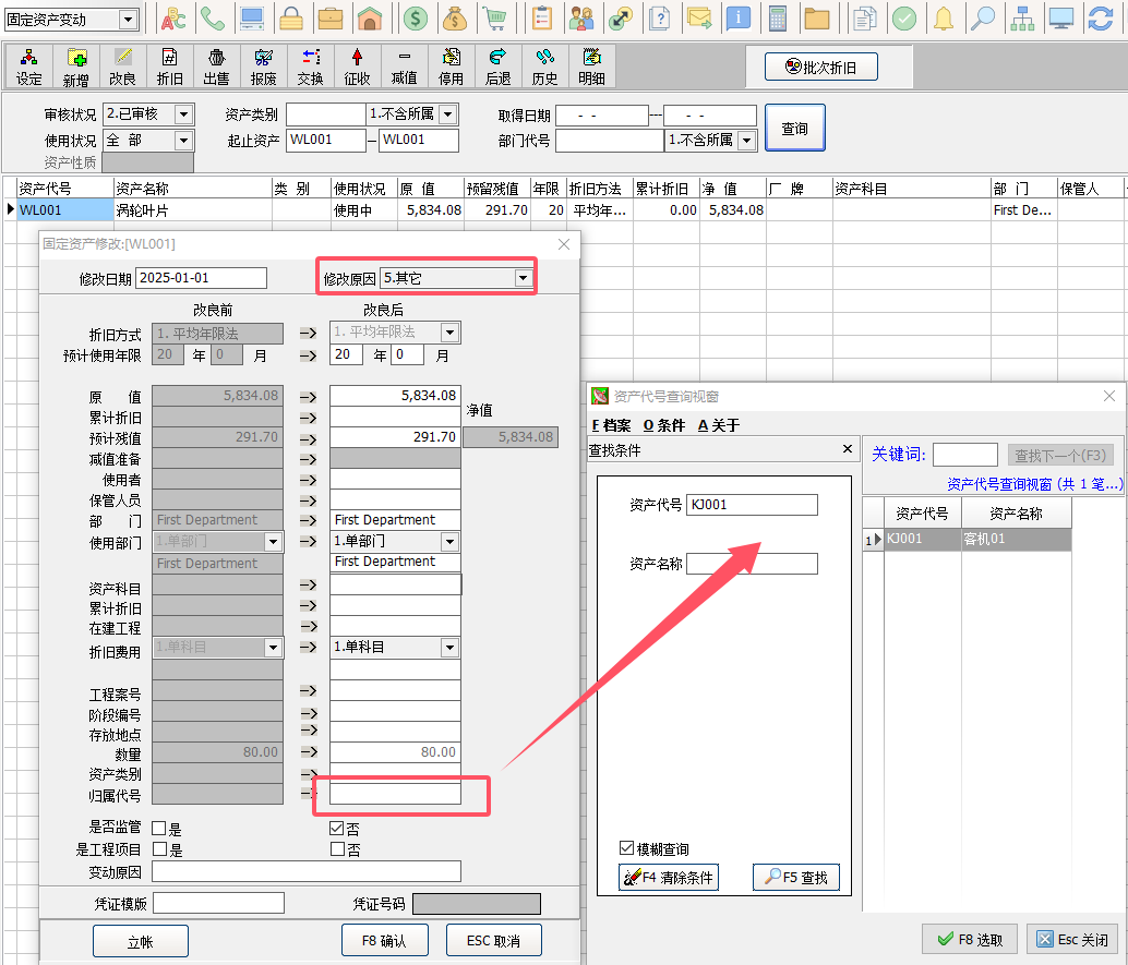 新增完畢后,在固定資產(chǎn)變動中過濾出配件部分選擇改良-其它,將配件歸屬代號選擇主固定資產(chǎn)即可