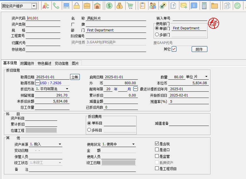 需求:企業(yè)的大型固定資產(chǎn)進行功能改良過程,會購入新的配件(配件的性質(zhì)也是固定資產(chǎn)價值高),該配件按常規(guī)的固定資產(chǎn)進行日常折讓、報廢、減值、停用、改變歸屬資產(chǎn)處理。希望但在報表(財產(chǎn)目錄、折舊提列統(tǒng)計表、固定資產(chǎn)折舊情況表)可以選擇查看大型固定資產(chǎn)的總價值。 用戶是走固定資產(chǎn)采購流程,采購入庫后產(chǎn)生新的固定資產(chǎn)。用固定資產(chǎn)變動將配件與主資產(chǎn)進行綁定,各種報表查詢按需查詢即可。以下以客機和渦輪葉片為例: